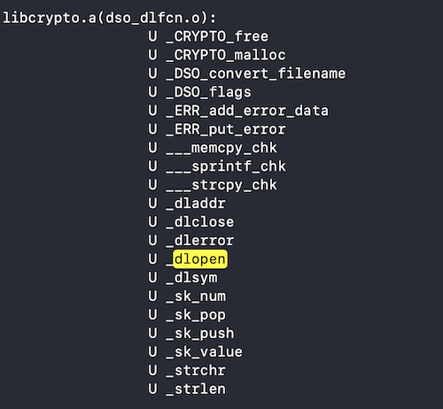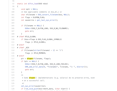 也可以看到是在dso_dlfcn文件中,于是去OpenSSL源码中查找这个文件,看看这个函数是在什么情况下编译到静态库中。